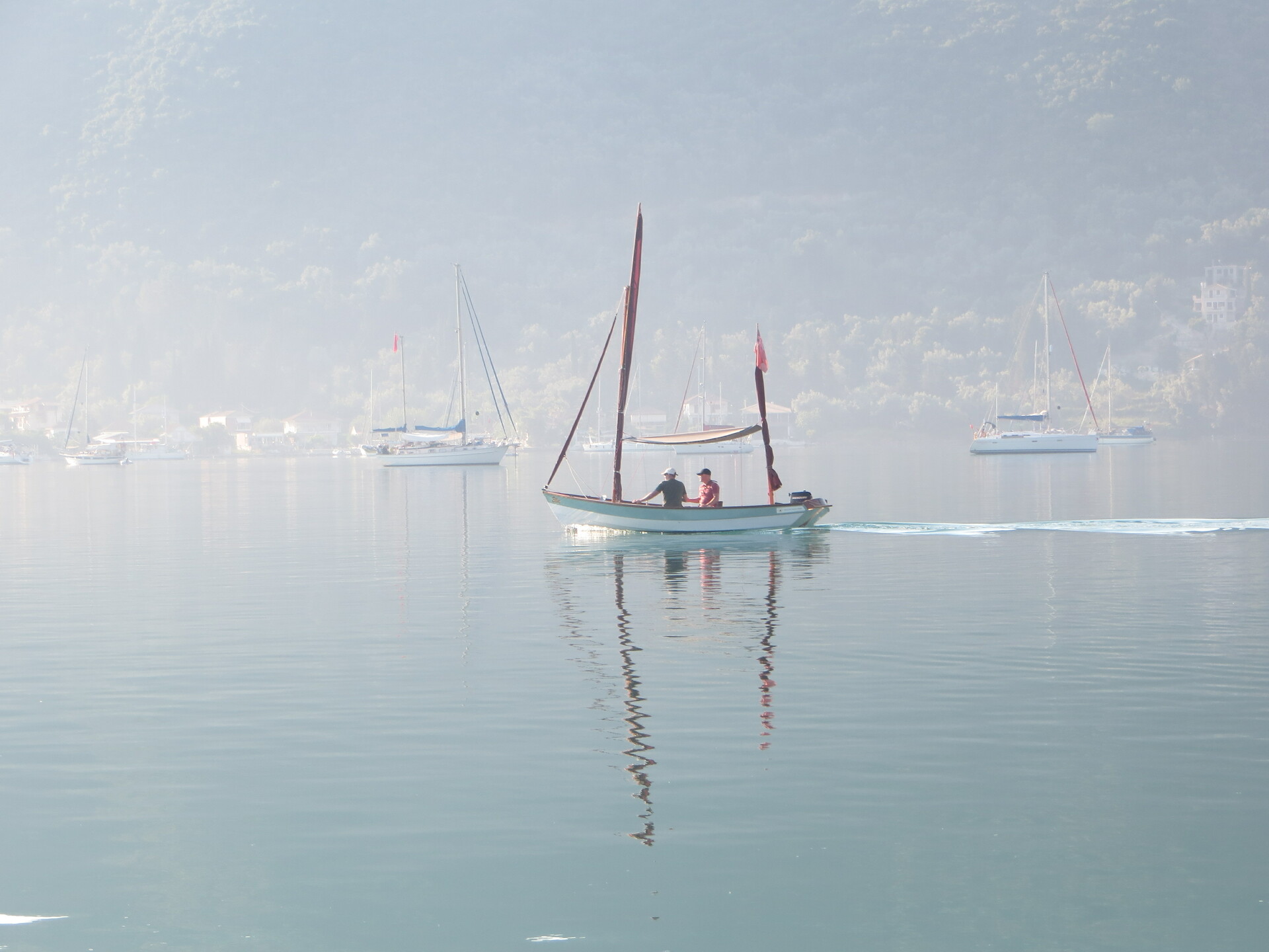 Passing Drascombe. Early morning, Vliho Bay, Lefkas.
